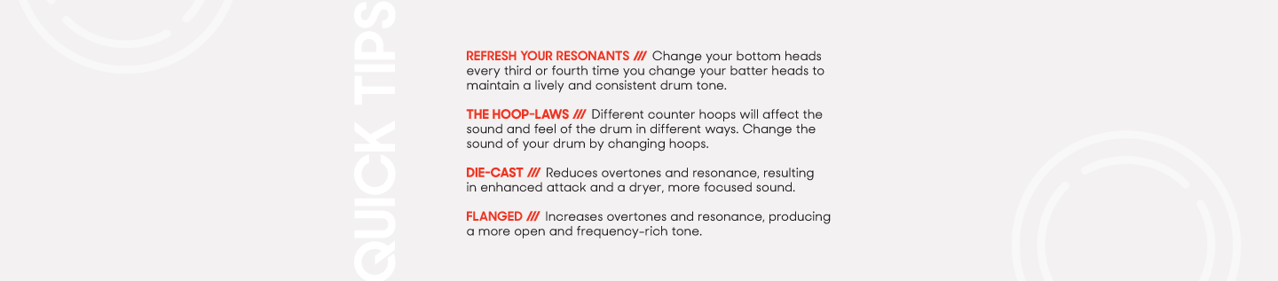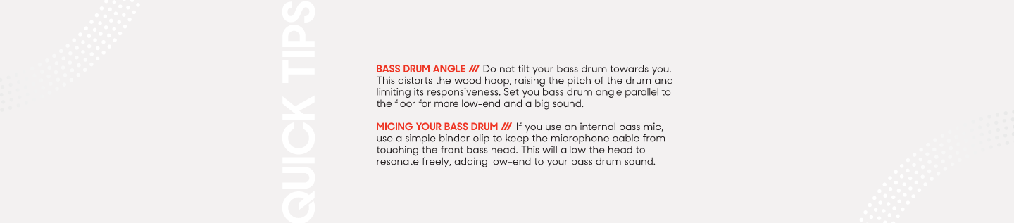 After initial tuning is complete, position the drum into playing position. Strike the front head slightly above the center and adjust the resonant and batter head as needed, using the “wrinkle technique” if necessary.