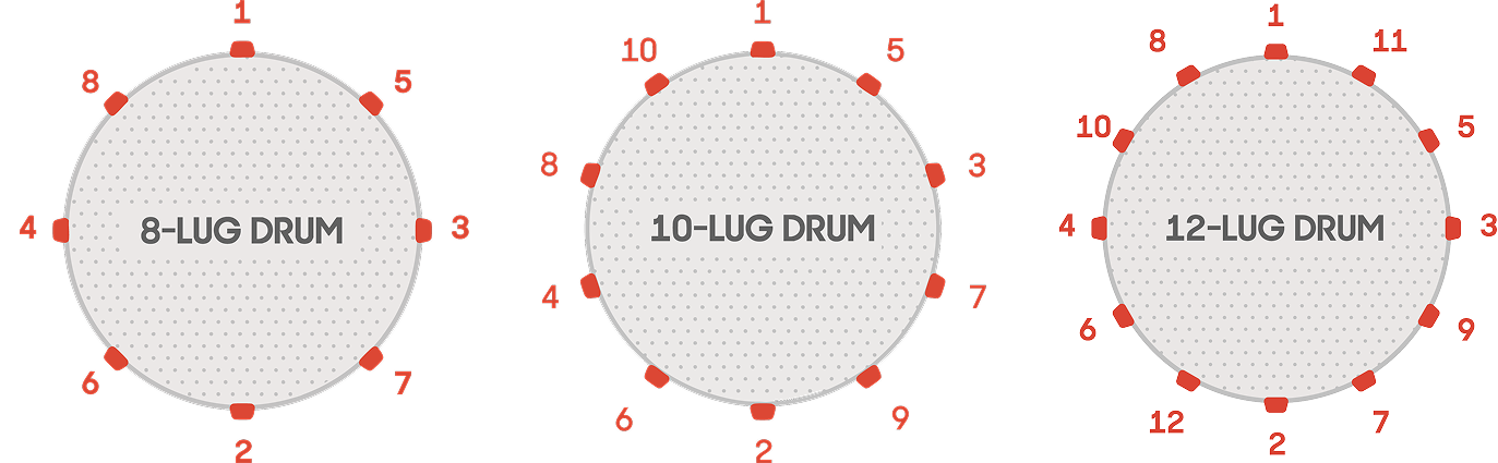 4. Starting with the largest drum, use the sequential tuning method to bring each head within its tuning range. Use a mallet to tap in front of each lug to ensure that all lugs produce an identical