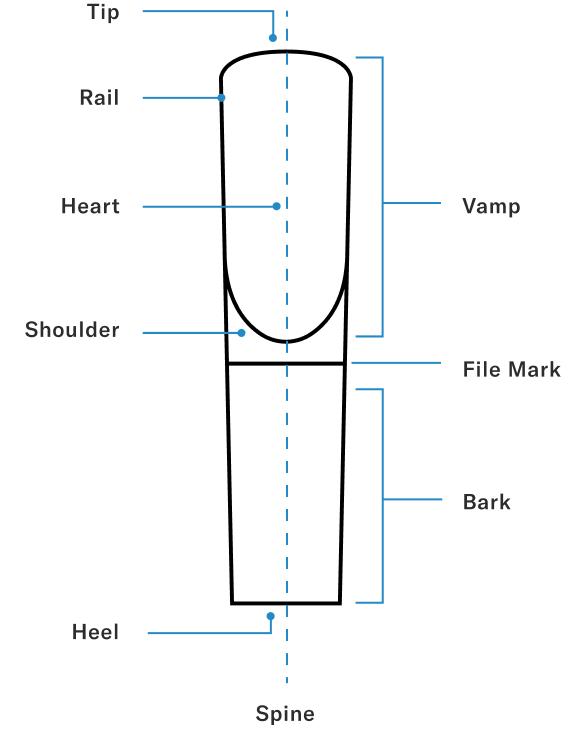 The tapered section from tip to shoulders. The vamp's shape influences how the reed vibrates and determines it's overall character.