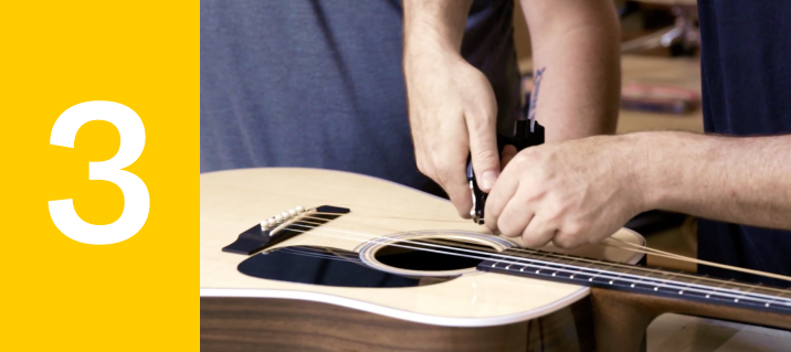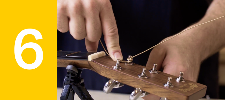 1. Start by threading the string through the appropriate hole in the bridge. Make sure the ball end of the string is securely seated or it can slip, causing tuning issues.
