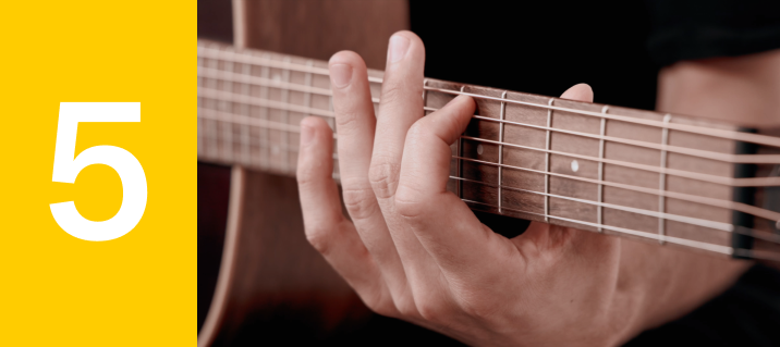 I know that switch up was crazy, but rest assured we’re back to our old ways now. Place your finger on the fifth fret of the B string. Pluck the open high E string, the thinnest, and adjust its tension to match the reference pitch of the B at the 5th fret. Ensure that the pitch is the same between strings.